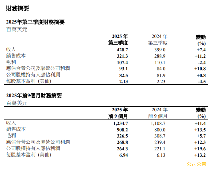 【财华社讯】中远海运港口(01199.HK)公布,截至2025年9月30日止9个月业绩,总吞吐量同比上升5.6%至1.13亿标准箱;权益吞吐量同比上升3%至3480.16万标准箱;公司收入同比上升11.4%至12.35亿美元;公司股权持有人应占利润同比上升19.6%至2.64亿美元;每股基本盈利6.94美仙。