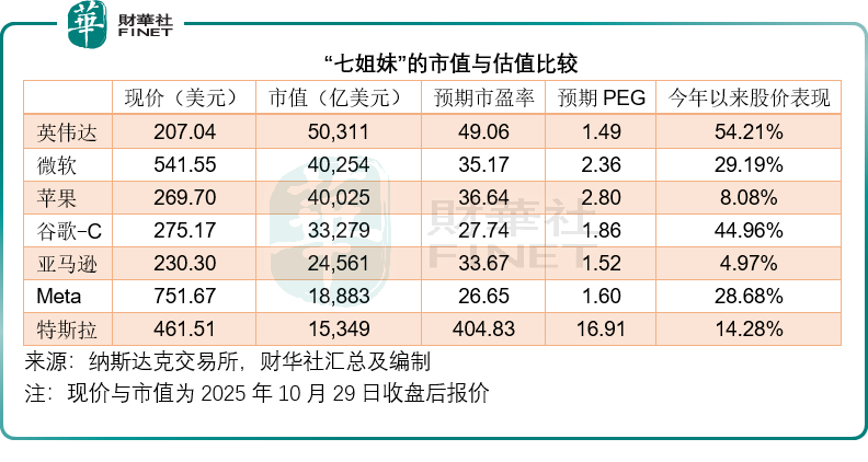 但是从下表可以看到,英伟达的预期PEG率也是“七姐妹”之中的最低,也就是说,对比于其他科技企业,资本市场对其增长预期的检视更为严格,一旦其增长表现低于预期,若要维持当前的预期PEG估值,其估值可能会遭到下调。