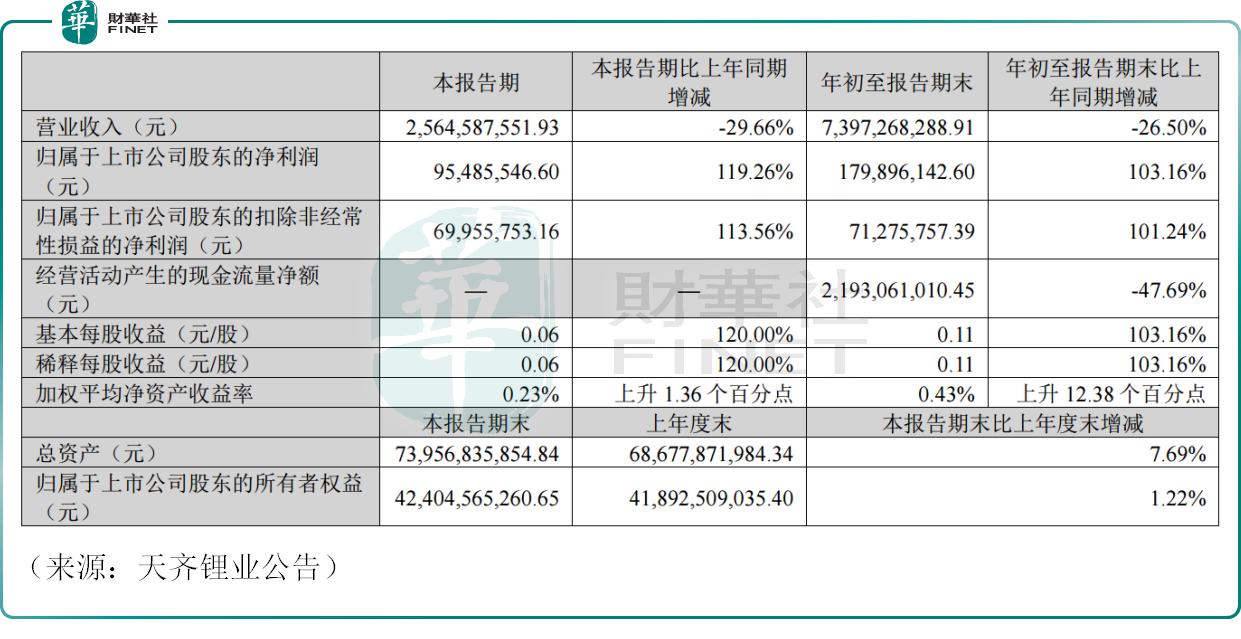 数据显示,天齐锂业第三季度营收为25.65亿元,同比下降29.66%;归母净利润为9548.55万元,同比扭亏为盈。