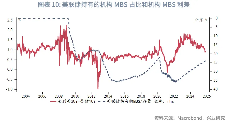当前美国经济存在韧性,美债收益率难以顺畅下行。若未来经济韧性得到官方就业数据印证,收益率可能出现反弹。预计形势未明朗前,10Y收益率维持偏弱区间运行,下方支撑3.9%、3.8%,上方阻力4.1%、4.2%。虽然总量缩表12月结束,但结构性的机构MBS缩表仍在延续。作为机构MBS的重要买家,美联储在存量MBS市场的占比下降和持有的国债资产久期缩短,将限制机构MBS相对美债利差的收敛空间。