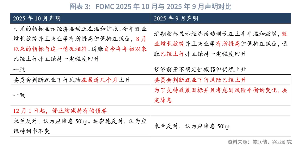本次议息会议声明措辞略有修改,在政府关门导致经济数据有限的情况下,现有数据仍然显示出经济扩张,同时也确认了就业市场下行风险上升。新任理事米兰连续两次投出反对票,继续认为应降息50bp。但另一位委员施密德认为此次应保持利率不变,反映了联储内部分歧加剧。