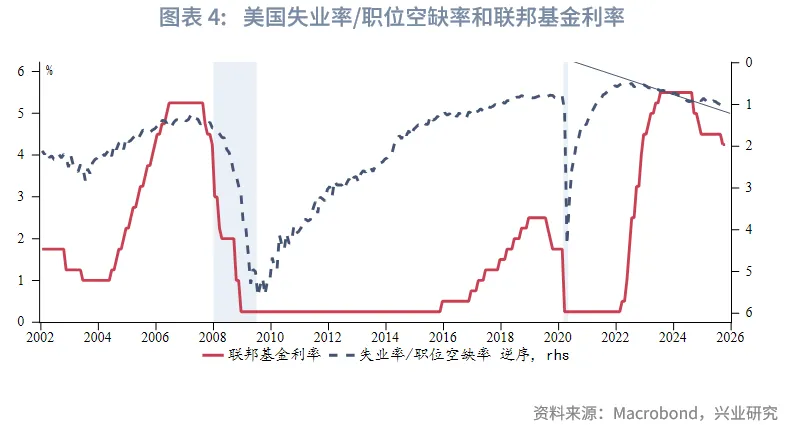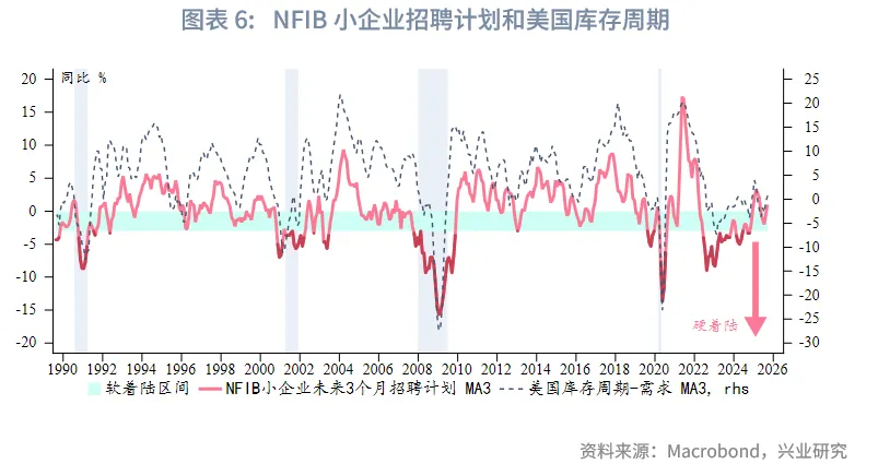 美联储将政策重心转向“充分就业”,但美国政府关门致使关键就业指标缺失。截至8月的失业率/职位空缺率显示美国劳动力市场依然呈现“软着陆”的特征,这主要得益于当前劳动力的“供需双降”达到微妙平衡。从私人部门就业数据看,9月“挑战者”裁员人数明显减少,失业率持续上升的压力有望减轻。此外,NFIB中小企业招聘计划同比和美国库存周期高度同步,并且招聘计划同比低于-3%时,意味着就业市场硬着陆、经济衰退的风险增加。目前招聘计划同比转正,与近期库存周期指标的边际反弹一致。从库存周期历史经验看,虽然当前已经转入主动去库存,但正处于平台期且年内需求有望保持韧性,预计明年上半年或再度面临需求下滑、完成第二库存周期触底。由此推演,年内就业市场进一步恶化的风险有限,未来公布的官方就业数据或证实韧性,需要警惕市场对于2026年降息预期进一步收敛的风险。