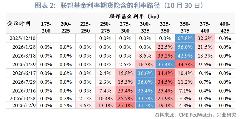 北京时间10月30日凌晨,美联储公布10月议息会议结果,如期降息25bp,联邦基金目标利率上限降至4%。同时,美联储宣布将于12月起停止缩表。新闻发布会上,美联储主席鲍威尔的表态意外偏鹰,市场对美联储12月的降息预期由此前的90%显著下降至68%,对2026年的降息预期也由75bp缩窄至50bp。