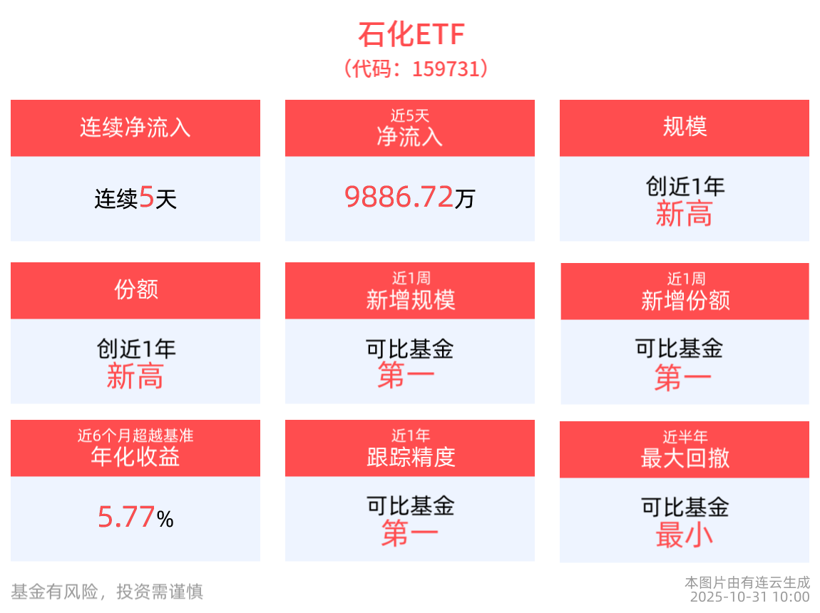 跟踪精度方面,截至2025年10月30日,石化ETF近1年跟踪误差为0.037%,在可比基金中跟踪精度最高。