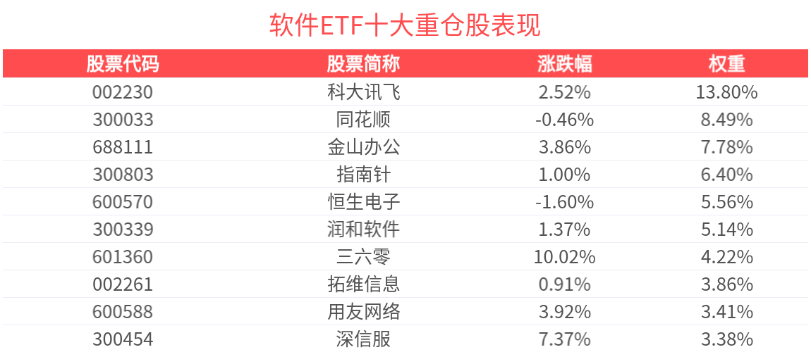 数据显示,截至2025年9月30日,中证软件服务指数前十大权重股分别为科大讯飞、同花顺、金山办公、指南针、恒生电子、润和软件、三六零、拓维信息、用友网络、深信服,前十大权重股合计占比62.41%。