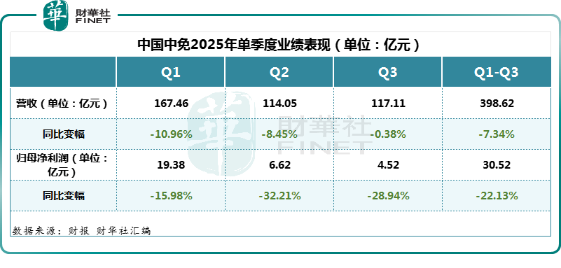 财报显示,2025年前三季度,中国中免实现营收约398.62亿元(单位人民币,下同),同比下降7.34 %;归母净利润约30.52 亿元,同比下降22.13%。