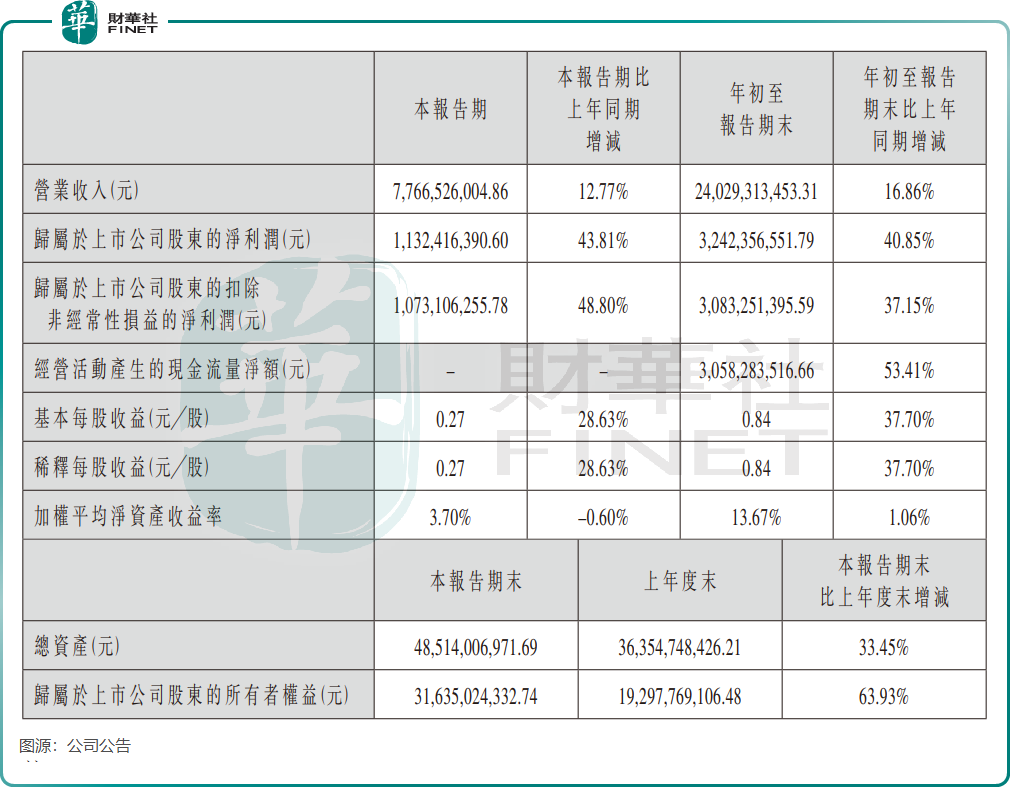 第三季度,公司实现营业收入77.67亿元,同比增长12.77%;归母净利润11.32亿元,同比大幅增长43.81%。整体来看,前三季度累计营收达240.29亿元,同比增长16.86%;净利润32.42亿元,同比增长40.85%,盈利增速亮眼。