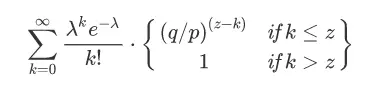 收款人等到此笔交易被打包进区块,并已经有个区块随后被加入。他并不知道攻击者的工作进展究竟如何,但是可以假定诚实区块在每个区块生成过程中耗费的平均时间;攻击者的潜在进展符合泊松分布,其期望值为: