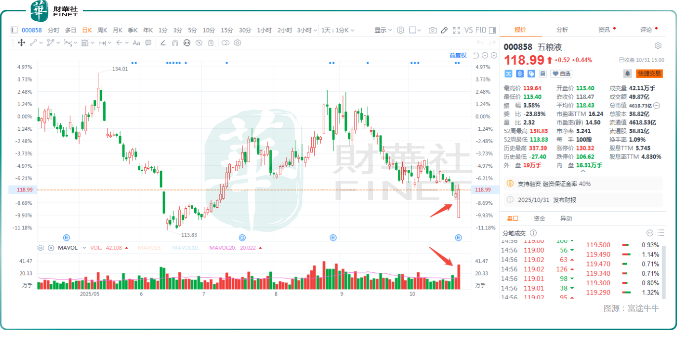 其中,在五粮液披露“暴雷”业绩后,其股价在低开2.6%的情况下,迅速上攻,最终放量收涨0.44%,显得比较强势。