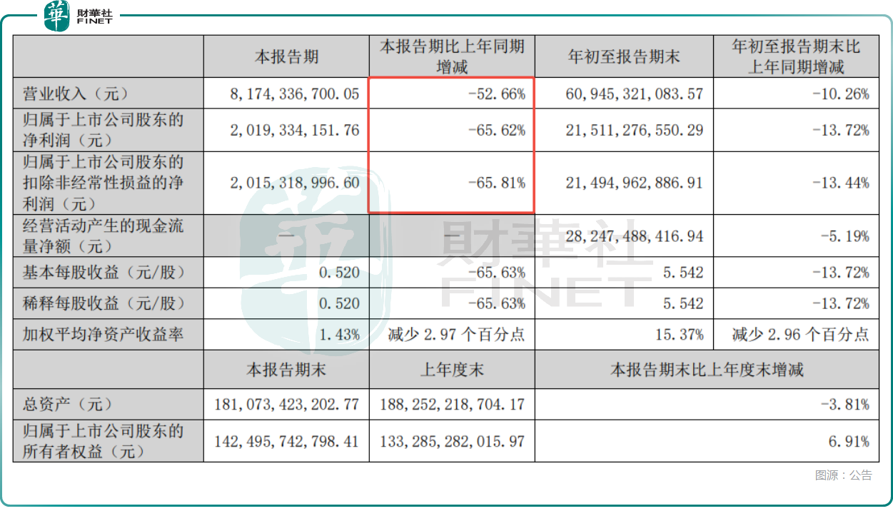 其中,第三季度,五粮液实现营业总收入81.74亿元,同比下降52.7%,环比下降48.4%;实现归母净利润20.19亿元,同比暴降65.6%,环比下降56.4%;实现扣非后归母净利润20.15亿元,同比暴降65.8%,环比下降56.4%。