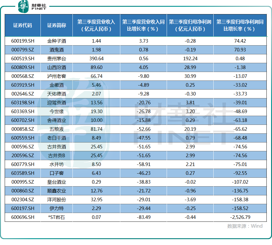 还是以今年第三季度的业绩为例:在营收端,21只白酒股中仅有山西汾酒(600809.SH)、金种子酒、酒鬼酒、贵州茅台(600519.SH)的第三季度营收实现增长,其中表现最好的山西汾酒同比增速也仅为4.1%。