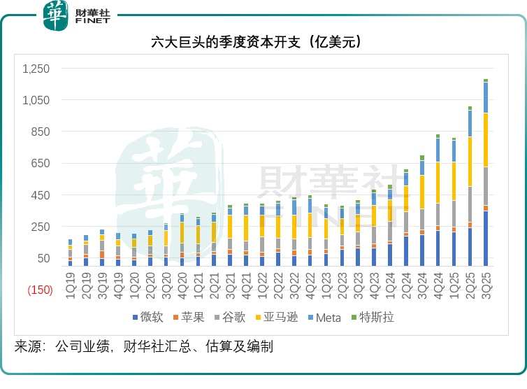 见下图,六大巨头的资本开支增速从2024年起明显加快,2025年第2季起已开始快跑。根财华社的统计,这六大巨头于2025年9月财季的合计资本开支达到1,184亿美元,较上年同期的700亿美元高出69.22%,而且都不约而同地表示会继续加码。