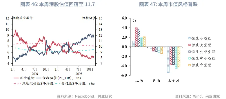 二级市场方面,本周港股整体震荡回调,主要指数普遍下跌,恒生指数、恒生科技指数与恒生高股息指数分别下跌1.0%、2.5%和0.3%。主要受乐观预期基本兑现与外部流动性压力再现的双重影响:一方面,中美元首会晤虽释放积极信号但缺乏超预期成果,部分投资者将会谈细节(如会谈时长有限、未设联合记者会等)解读为双方深层分歧仍在;另一方面,美联储主席鲍威尔释放鹰派信号,称12月未必降息,进一步压制风险资产估值,对港股科技板块形成明显压力。板块方面,防御型板块表现相对稳健,而资讯科技业领跌2.9%,反映资金在不确定性中转向守势。资金与情绪方面显现积极信号:南向资金本周净流入275亿港元,较上周显著增加,外资亦有所回流。流动性方面,港汇在靠近强方兑换保证区间窄幅波动,1个月期HIBOR小幅回落,整体环境保持温和。