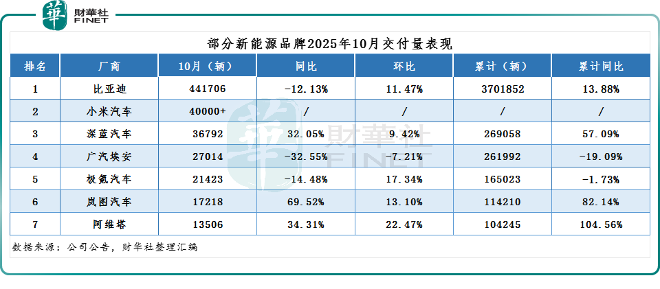 跨界造车新秀方面,小米汽车表现稳健,10 月交付量再次突破4万辆,成为行业不可忽视的新生力量。