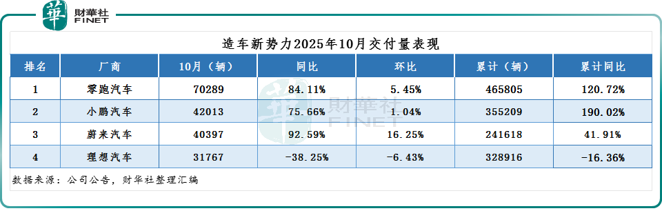 在新势力阵营中,零跑汽车10月交付达70289辆,同比增长84.11%,环比增长5.45%,首次突破7万辆大关,再创历史新高。1-10月,零跑汽车累计交付了46.58万辆汽车,同比大增120.72%。