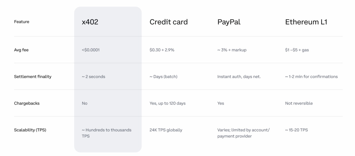 相较于传统支付方案(如银行卡、Stripe、PayPal、或 OpenAI 预付积分制),x402 的结构更接近互联网底层标准,