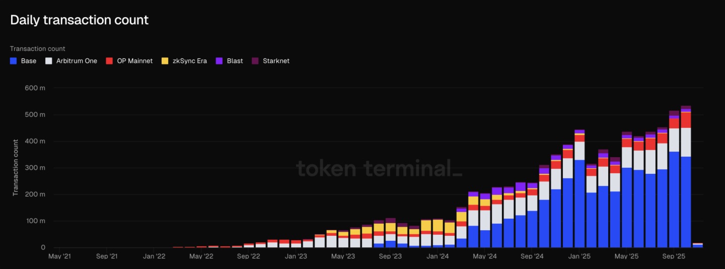根据Token Terminal最新数据,以太坊Layer2网络的月交易量持续强劲增长,今年10月总计完成超过5.3亿笔交易,创下历史新高,是同期主网(4800万笔)的11倍左右。在各L2网络中,Base以绝对优势贡献64.2%的交易量(约3.4亿笔),成为生态中最活跃的链,其交易激增或受到发币计划的刺激。其次是Arbitrum One和OP Mainnet,交易占比分别约为15%和12%。