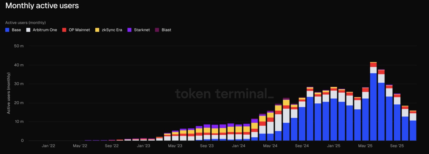 从月活跃用户数据来看,L2网络在10月呈现下滑与分化加剧的趋势。Token Terminal 最新数据显示,L2月活跃用户达1610万个,较今年6月的历史峰值4170万个下滑了61.4%,但远超过以太坊主网的830万个。其中,Base仍保持绝对领先,占比达67.1%,但用户增速较前几个月明显放缓;Arbitrum One紧随其后,占比22.9%,表现相对稳定;zkSync Era、Starknet和Blast等其他链用户流失较历史峰值也较为明显。