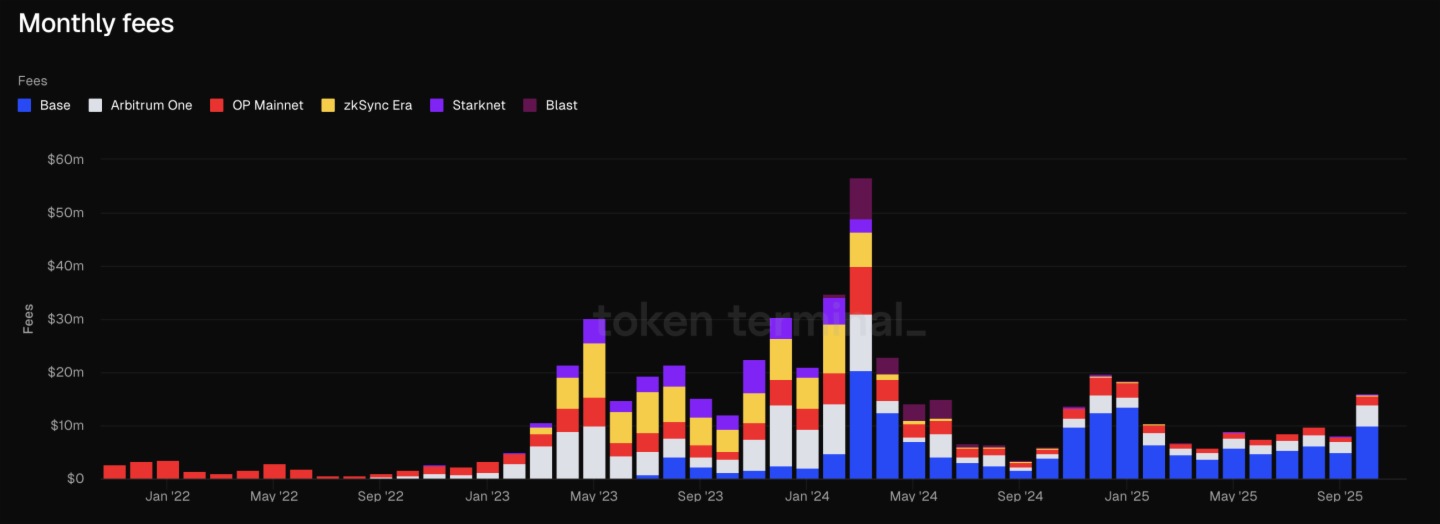 而L2网络的费用在近期也出现显著回暖。从每日手续费收入(Fees)来看,自2024年5月达到历史峰值超5.6亿万美元后,L2板块整体呈现断崖式下滑趋势。尽管期间Dencun升级大幅降低了数据成本、更多L2项目扩容上线,但手续费收入并未因此回暖,反而因链上活动退潮、Gas叙事降温以及生态兑现不及预期等多重因素而加速萎缩。到2025年10月,整个L2板块的月度手续费接近1.6亿美元,仅为峰值的28.1%,但创下今年2月以来新高。其中,Base、Arbitrum One、OP Mainnet三者占据了总手续费的约98.3%。