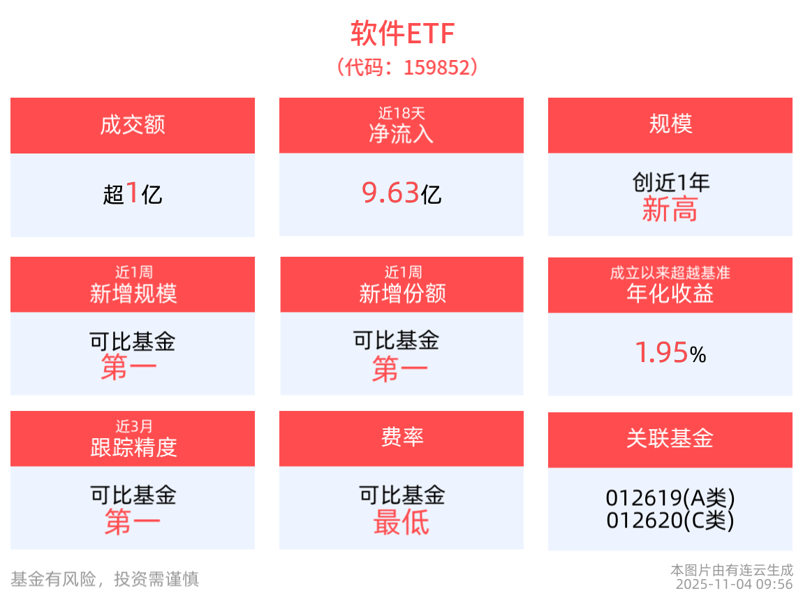 资金流入方面,软件ETF最新资金净流入1.36亿元。拉长时间看,近18个交易日内,合计“吸金”9.63亿元。