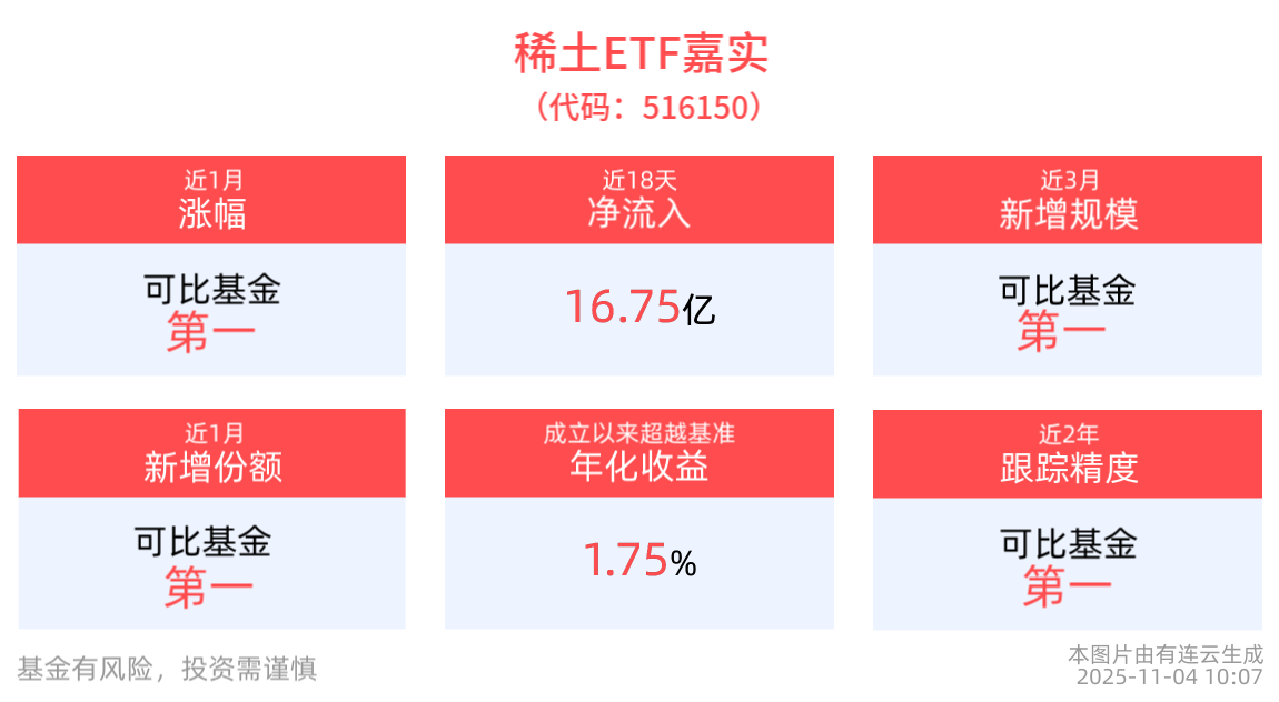 截至11月3日,稀土ETF嘉实近2年净值上涨86.47%,指数股票型基金排名105/2380,居于前4.41%。从收益能力看,截至2025年11月3日,稀土ETF嘉实自成立以来,最高单月回报为41.25%,最长连涨月数为4个月,最长连涨涨幅为83.89%,上涨月份平均收益率为10.57%。