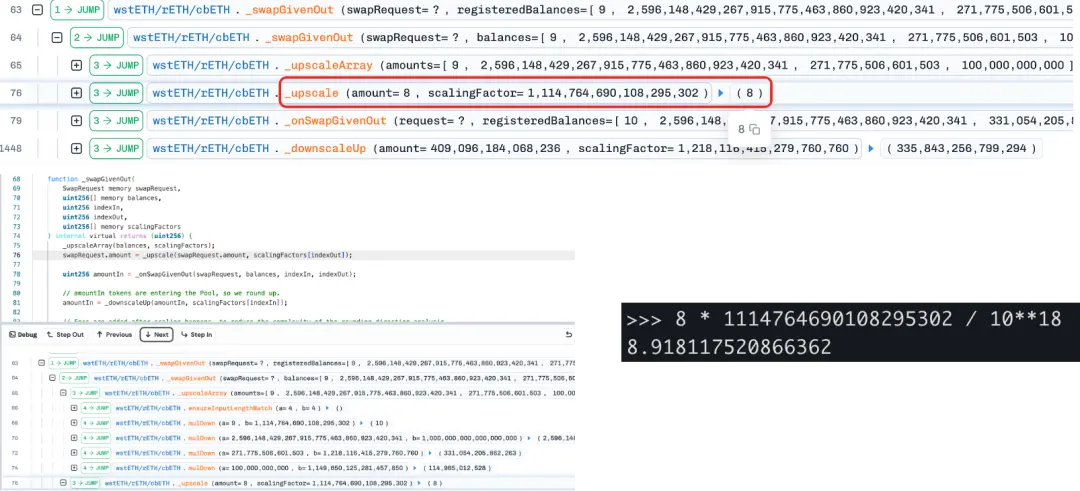 第二阶段:攻击者使用精心构造的数量(= 8),在另一种底层资产(wstETH)与 cbETH 之间进行交换。由于在缩放代币数量时进行了向下取整(rounding down),计算得到的 Δx 略小(从 8.918 变为 8),从而导致 Δy 被低估,并使不变量 D(来源于 Curve 的 StableSwap 模型)变小。由于 BPT 价格 = D / totalSupply,BPT 价格被人为压低。