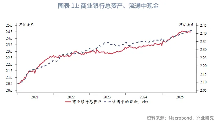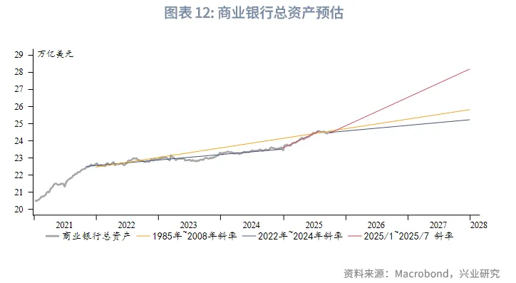 与流通中的现金类似,在美联储货币政策和美国财政政策暂时均不转向激进宽松的前提下,2022年~2024年的商业银行总资产增速和历史长期增速接近,但2025年上半年受到降息刺激出现了较高增速。据此,我们分别模拟资产的温和增速和高增速两种情景。