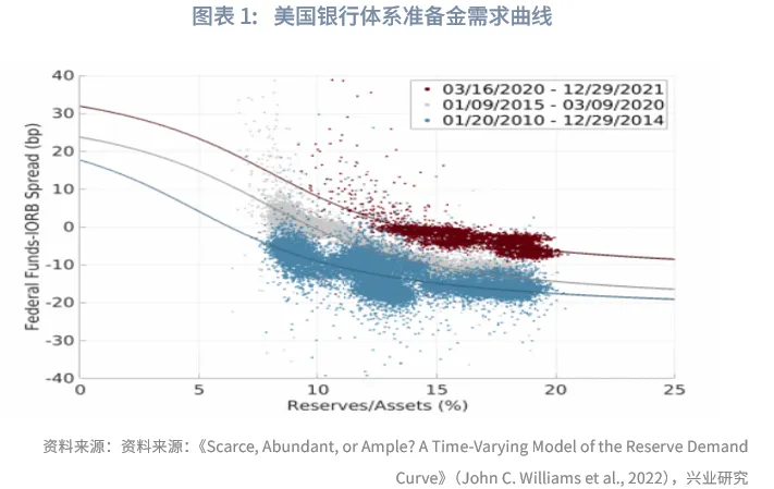 目前可参考的美联储缩表经验主要为2018年~2019年,纽约联储根据这一时期的市场变化在工作论文中指出:以准备金余额与商业银行总资产之比为基准,对银行体系准备金富裕(abundant)、充足(ample)、稀缺(scarce)进行了界定。文章中将准备金余额与商业银行总资产之比、FFR-IORB利差分别代表准备金需求的“量”与“价”,两者构成准备金需求曲线。准备金需求曲线从平坦(准备金富裕)转变为略微倾斜(准备金充足)对应的准备金余额与商业银行总资产之比约为12%~13%,从略微倾斜变得陡峭(准备金稀缺)对应的比率为8%~10%。