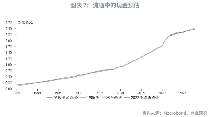 (1)除去次贷危机后的长期低利率时期和2020年至2021年大量现金发放使得现金快速增长,其他时期现金保持较为稳定的增速。在美联储货币政策和美国财政政策暂时均不转向激进宽松的前提下,我们分别以1985年~2008年和2022年以来的现金增速线性外推未来两年的现金增长。