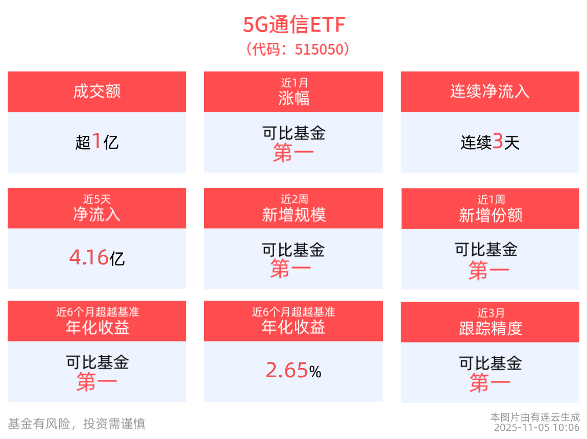 数据显示,截至11月4日,5G通信ETF近3年净值上涨156.43%,指数股票型基金排名6/1906,居于前0.31%。从收益能力看,截至2025年11月4日,5G通信ETF自成立以来,最高单月回报为37.75%,最长连涨月数为5个月,最长连涨涨幅为113.89%,涨跌月数比为39/34,上涨月份平均收益率为8.26%,年盈利百分比为80.00%。截至2025年11月4日,5G通信ETF近6个月超越基准年化收益为2.65%,排名可比基金第一。