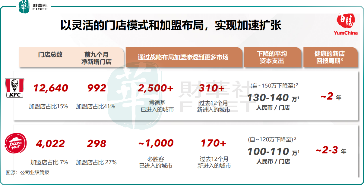 下沉市场是扩张的重点,肯德基和必胜客分别进入了2500+和约1000座城市。得益于加盟店比例提升和门店模型优化,两大品牌的开店平均资本支出有所下降,新店回报周期保持健康,这成为百胜中国在竞争激烈的市场中保持利润稳健增长的关键因素之一。