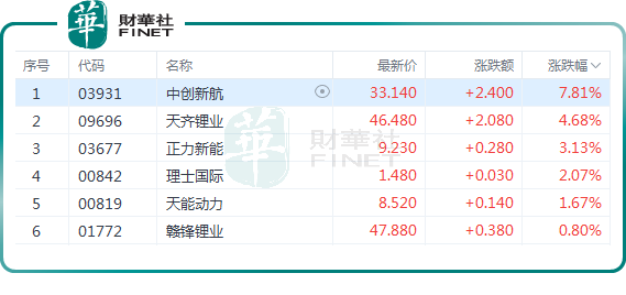 港股方面,截至收盘,中创新航(03931.HK)大涨7.81%,天齐锂业(09696.HK)涨4.68%,正力新能(03677.HK)涨3.13%,理士国际(00842.HK)涨2.07%,天能动力(00819.HK)涨1.67%,赣锋锂业(01772.HK)跟涨。