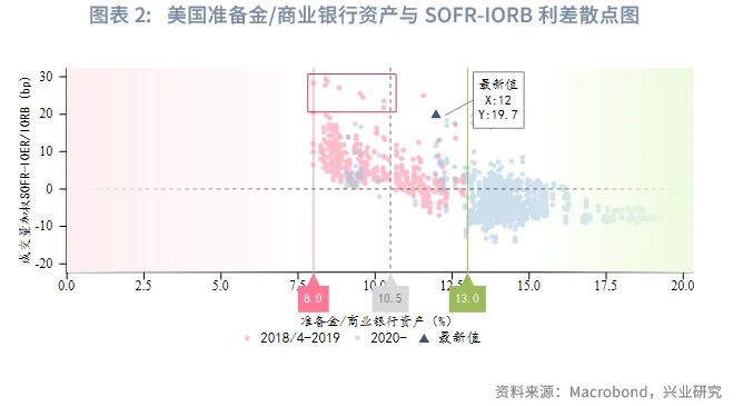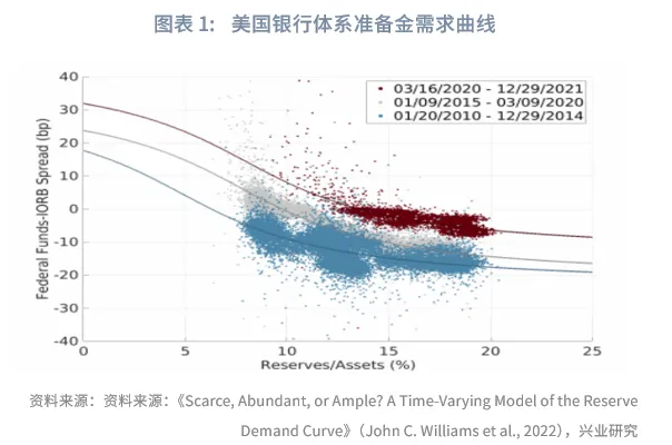 目前可参考的美联储缩表经验主要为2018年~2019年,纽约联储根据这一时期的市场变化在工作论文中指出:以准备金余额与商业银行总资产之比为基准,对银行体系准备金富裕(abundant)、充足(ample)、稀缺(scarce)进行了界定。文章中将准备金余额与商业银行总资产之比、FFR-IORB利差分别代表准备金需求的“量”与“价”,两者构成准备金需求曲线。准备金需求曲线从平坦(准备金富裕)转变为略微倾斜(准备金充足)对应的准备金余额与商业银行总资产之比约为12%~13%,从略微倾斜变得陡峭(准备金稀缺)对应的比率为8%~10%。