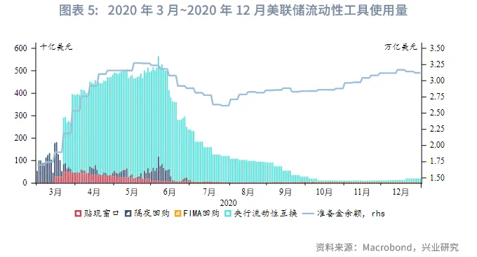 作为应对:2018年12月,美联储停止加息。2019年1月,美联储暗示放缓缩表。2019年3月,美联储公布退出缩表计划。2019年8月,美联储开启降息并提前结束缩表。2019年9月美联储重启回购便利(RP,repurchase facility),也是从这一时点起,美联储“被动扩表”。至2019年末,在累计降息75bp并且保持500亿美元(高峰时近900亿美元)回购便利使用量的情况下,流动性危机逐渐平息。直至2020年3月新冠疫情引发美国经济衰退,美联储才正式重启QE,开始“主动扩表”。
