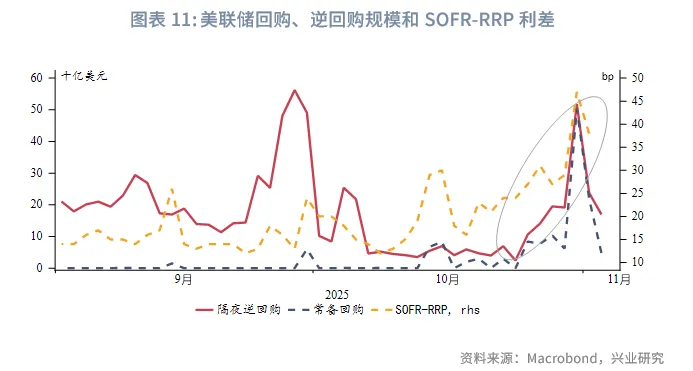当前准备金余额/商业银行总资产约为12%,刚刚跌破13%的“充足”阈值,距离10.5%的“稀缺”阈值还有一定空间。10月末、11月初的流动性异常紧张是多方面作用的结果,主要原因包括:(1)9月美国财政部大幅提高TGA余额水平叠加税期,吸收了美联储逆回购和货币市场基金的冗余流动性;(2)10月以来的美国政府关门使得美国财政部囤积的现金无法释放,加大了准备金余额下降的压力;(3)可能是出于风险规避或满足监管要求等原因,机构向同业融出资金的意愿下降。这主要表现在10月下旬以来,尽管SOFR利率已经显著高于RRP利率,但美联储隔夜逆回购的规模不减反增,即机构更愿意将资金拆借给“无风险”的美联储。并且增加的常备回购使用量几乎完全匹配隔夜逆回购增长规模。这表明市场流动性总量本身处于较为均衡的状态,但由于风险偏好、月末效应效应等因素,出现了短暂的结构性失衡。目前常备回购足以填补流动性缺口。
