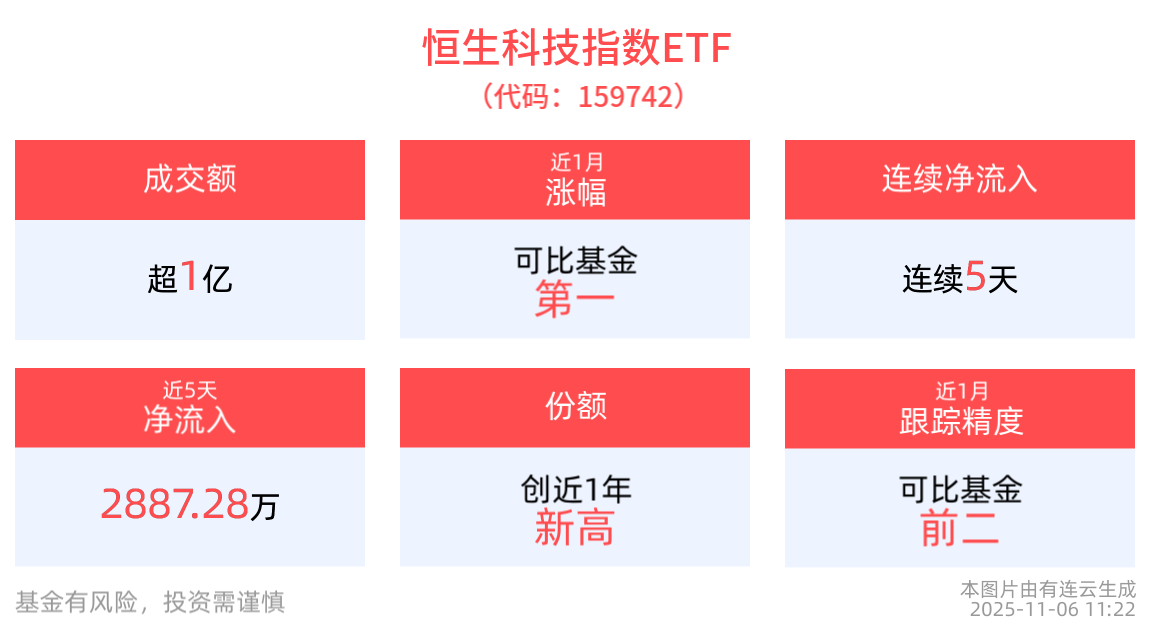 流动性方面,恒生科技指数ETF盘中换手4.17%,成交1.91亿元。拉长时间看,截至11月5日,恒生科技指数ETF近1月日均成交5.52亿元。