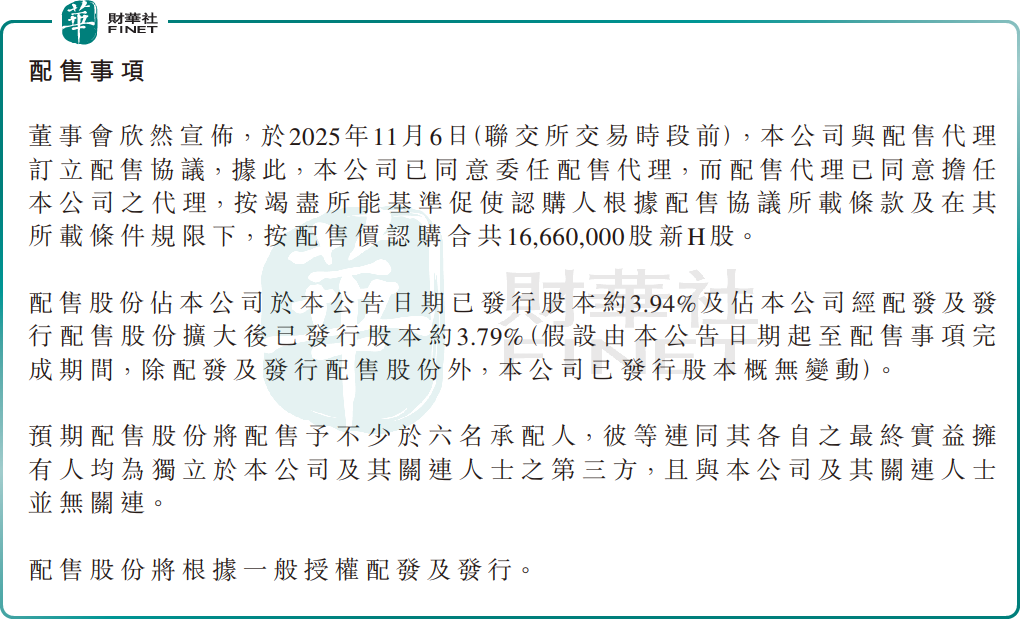 公告显示,越疆与配售代理订立配售协议。根据协议,公司将配售1666万股新H股,配售价每股46.80港元,较2025年11月5日收盘价52.2港元折让10.3%。本次配售预计募资约7.80亿港元,所得款项净额约7.71亿港元。