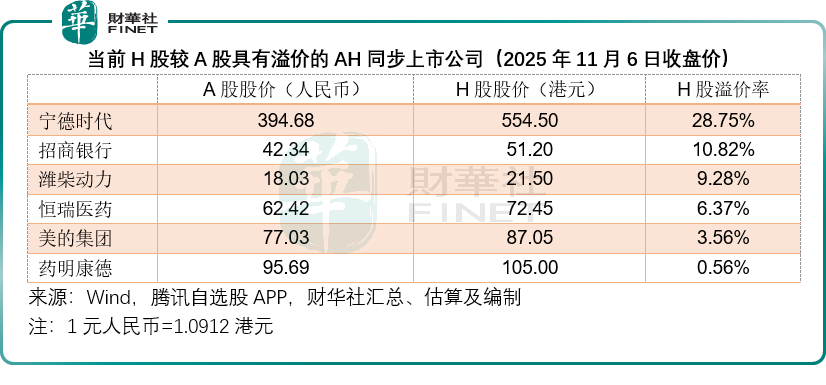 宁德时代、招商银行、潍柴动力、恒瑞医药(01276.HK)、美的集团(00300.HK)、药明康德(02359.HK)等企业的H股较A股溢价状态仍在持续,溢价率分别达28.75%、10.82%、9.28%、6.37%、3.56%和0.56%,见下表。
