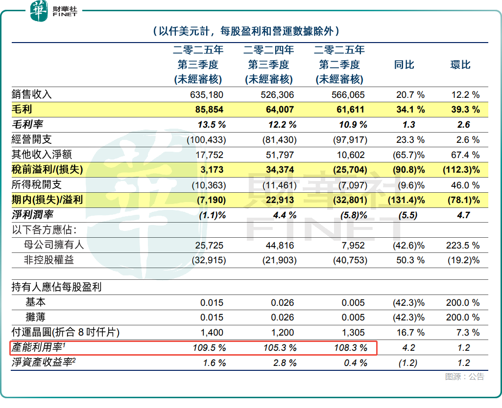 公告还显示,今年第三季度,华虹半导体的产能利用率进一步上升至109.5%,景气度高涨。