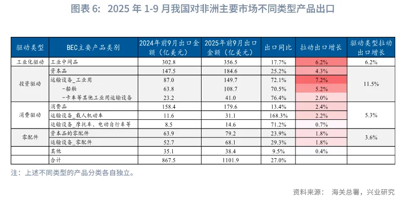 2025年前9月,工业化驱动类、投资驱动类、消费驱动类和零配件分别拉动我国对非洲主要市场出口增长6.2、11.5、5.3、3.6个百分点。上文提到,中国对非洲的船舶出口受到特殊政策的影响,剔除船舶后,投资驱动类的拉动下降到6.3个百分点。