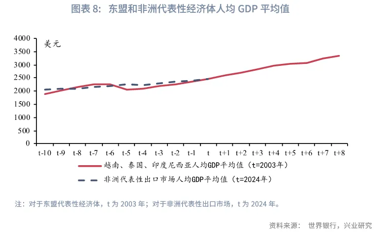 从人均GDP来看,2024年非洲代表性出口市场人均GDP为2453美元,同东盟代表性经济体2003年的2476美元较为接近。