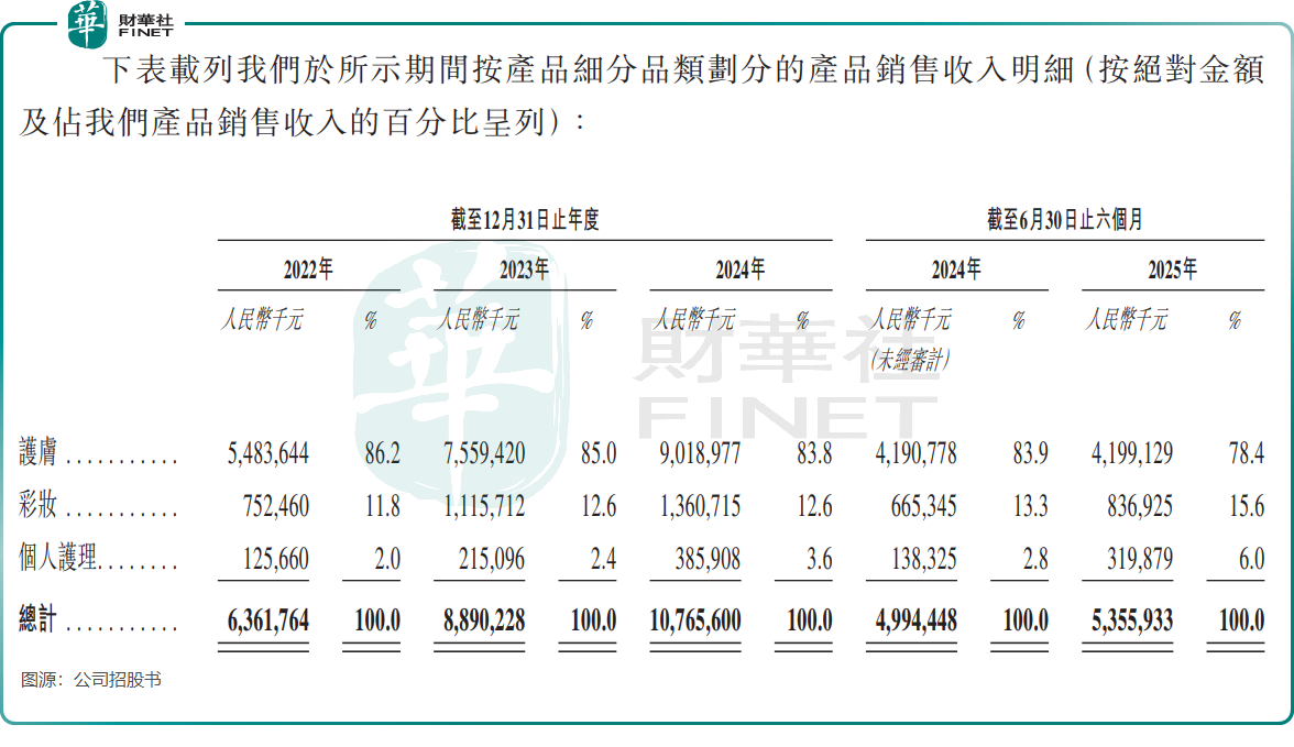 在护肤大类中,“珀莱雅”品牌仍是公司核心支柱,2025年上半年收入占比达74.3%。