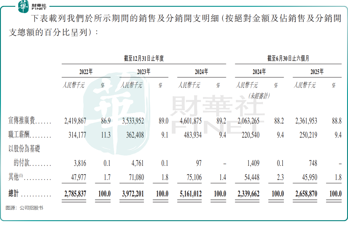 “重营销、轻研发”的失衡问题尤为突出。2025年上半年,公司销售及分销开支高达26.59亿元,占收入比重达49.59%。这意味着,公司将近一半的收入用于营销获客。