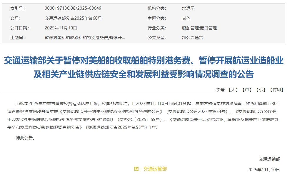 【财华社讯】11月10日,交通运输部网站公布,为落实2025年中美吉隆坡经贸磋商达成共识,经国务院批准,自2025年11月10日13时01分起,与美方暂停实施对华海事、物流和造船业301调查最终措施同步暂停实施《交通运输部关于对美船舶收取船舶特别港务费的公告》(交通运输部公告2025年第54号)、《交通运输部办公厅关于印发<对美船舶收取船舶特别港务费实施办法>的通知》(交办水〔2025〕59号)、《交通运输部关于启动航运业、造船业及相关产业链供应链安全和发展利益受影响情况调查的公告》(交通运输部公告2025年第55号)1年。