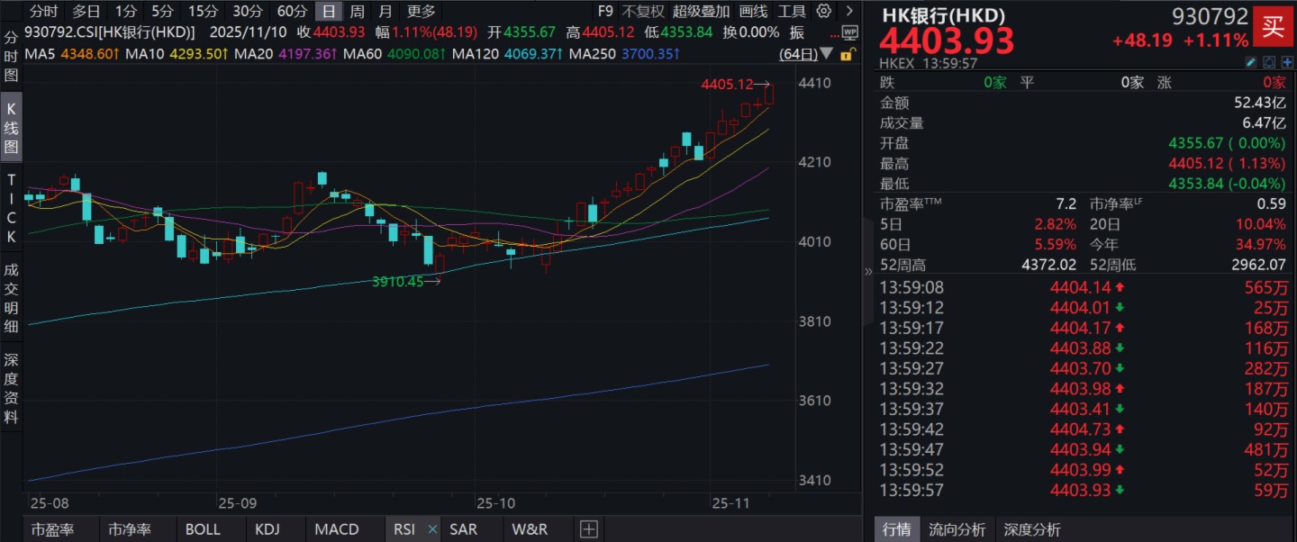 截至2025年11月10日 14:00,HK银行指数(930792)强势上涨1.11%,盘中点位创历史新高,成分股重庆银行(01963)上涨2.50%,中国光大银行(06818)上涨2.08%,工商银行(01398)上涨1.90%,建设银行(00939),中信银行(00998)等个股跟涨。