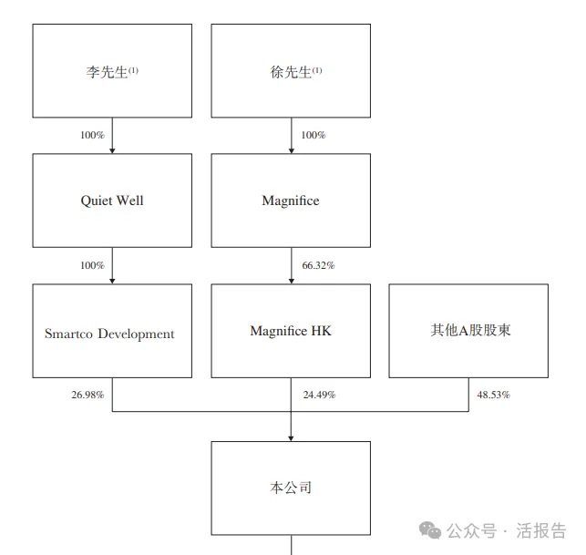 李西廷先生通过全资持有Quiet Well Limited间接控制 Smartco Development Limited,该平台直接持有公司约26.98%已发行股本;徐航先生通过全资持有Magnifice Limited控制 Magnifice (HK) Limited,该平台直接持有公司约24.49%已发行股本。两人合计控制公司已发行股本总额约51.47%的投票权,为核心控股方;