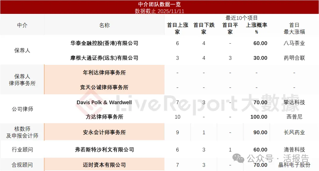 据LiveReport大数据统计,迈瑞医疗中介团队共计9家,其中保荐人2家,近10家保荐项目整体表现一般;公司律师共计2家,综合项目数据整体还行。