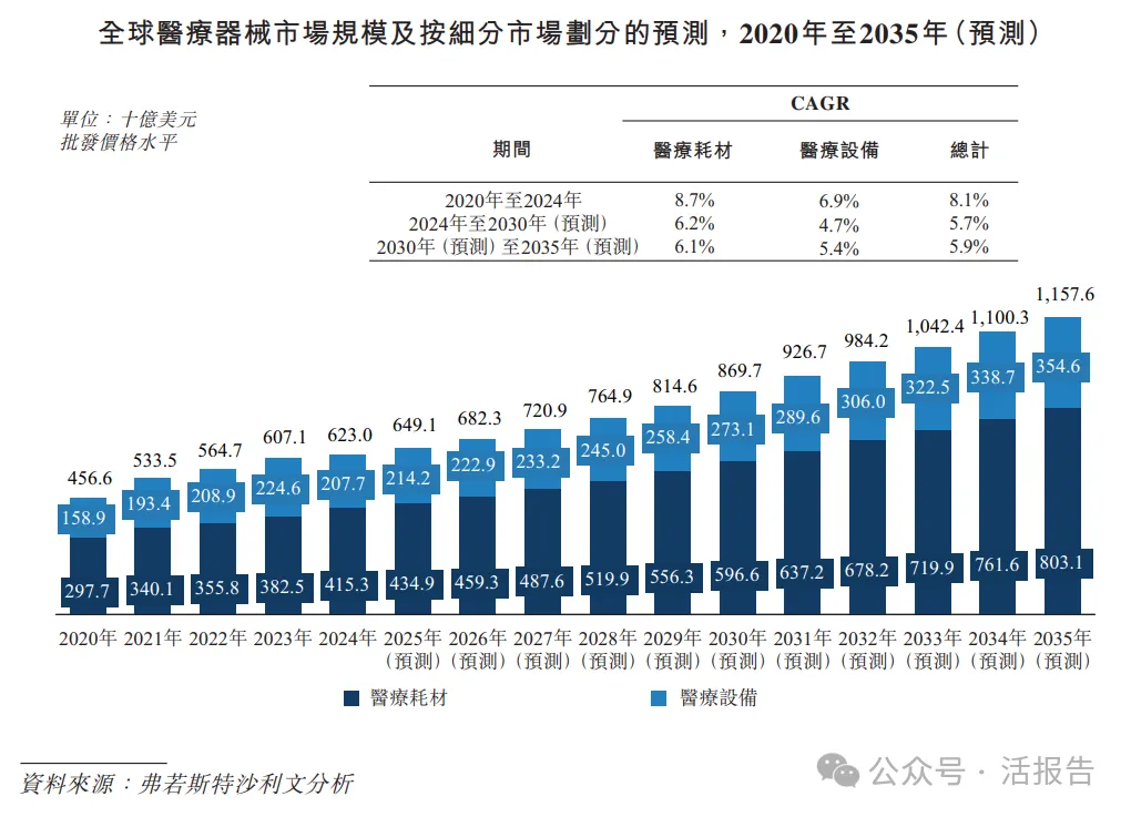 根据弗若斯特沙利文(Frost & Sullivan)的报告,全球医疗器械市场规模从2020年的4,566亿美元增长至2024年的6,230亿美元,2020年至2024年的CAGR为8.1%。预计市场将保持稳定的增长势头,2030年将达到8,697亿美元,2024年至2030年的CAGR为5.7%;到2035年将进一步增至11,576亿美元,2030年至2035年的CAGR为5.9%。