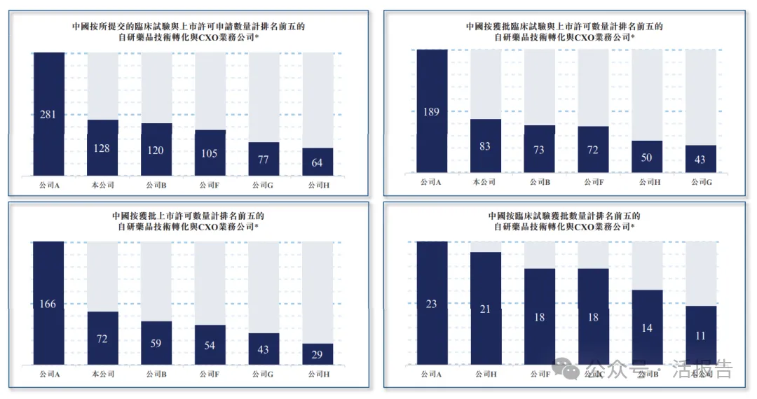 根据弗若斯特沙利文报告,在业绩记录期间及直至最后实际可行日期,公司于中国境内从事药物技术转移的CXO服务提供商中,按获批临床试验及上市许可总数排名第二,于同期提交的临床试验及上市许可申请总数方面亦排名第二。