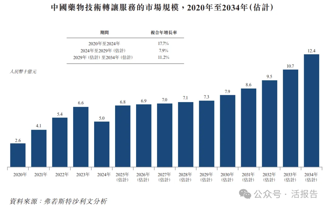 根据弗若斯特沙利文(Frost & Sullivan)的报告,中国药物技术转让的市场规模从2020年的人民币26亿元增长至2024年的人民币50亿元,复合年增长率达17.7%。预计到2034年,该市场规模增长至人民币124亿元。